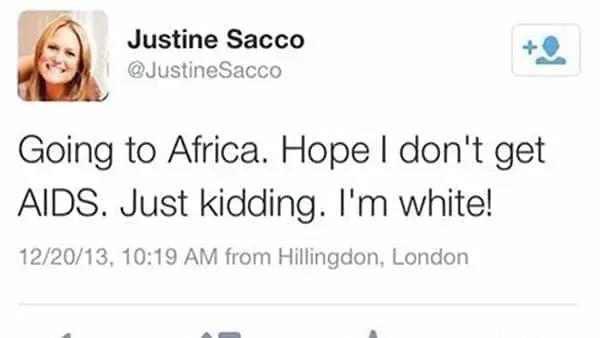 Justine Sacco – the Communications Director for IAC, a parent company for Vimeo, OkCupid, Tinder, CollegeHumor, and Dictionary.com – was flying to Cape Town when she Tweeted: ‘Going to Africa. Hope I don’t get AIDS. Just Kidding. I’m White!’
