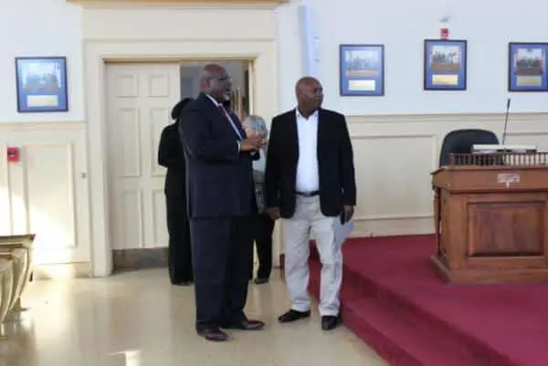 The Kenyan delegation was treated to a luncheon with hoagies and zeps, soft pretzels and tomato pie, fried chicken and collard greens before the bus tour of Norristown. Councilman William Caldwell and Public Works Director Robert Glisson joined the group for lunch where a lively discussion of American taxation and the government organizations that it funds occupied one half of the group.