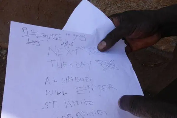“Next week on Tuesday, Al-Shabaab will attack St Kizito…… warning to Mr Fudicha and Mrs Recho,” the note reads.