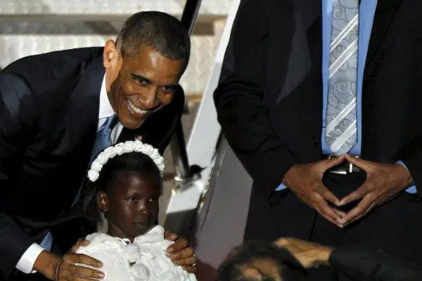 A little girl in a white dress waited with a bouquet of flowers at the bottom of the Air Force One staircase when US president Barack Obama landed at the JKIA on Friday night.