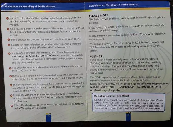 The new traffic guidelines issued by C.J Dr Willy Mutunga indicate that: “Traffic police officers can only arrest offenders and/or detain offending vehicles in serious offences such as causing death by dangerous driving, driving under the influence of alcohol and driving a vehicle without insurance” .