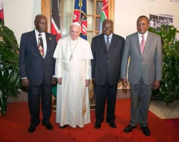 Pope Francis who had earlier on recieved a 21 gun salute from the Military, took some time after his address to take photo with some of the invited dignitaries including former Presidents, Daniel Moi and Mwai Kibaki.