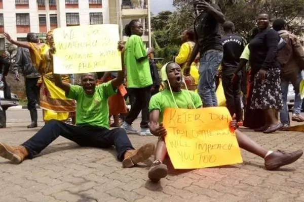 The youth marched outside the Integrity Centre carrying placards written, “Keter don’t try otherwise we will impeach you too” and “We want Waiguru to continue with the project”.