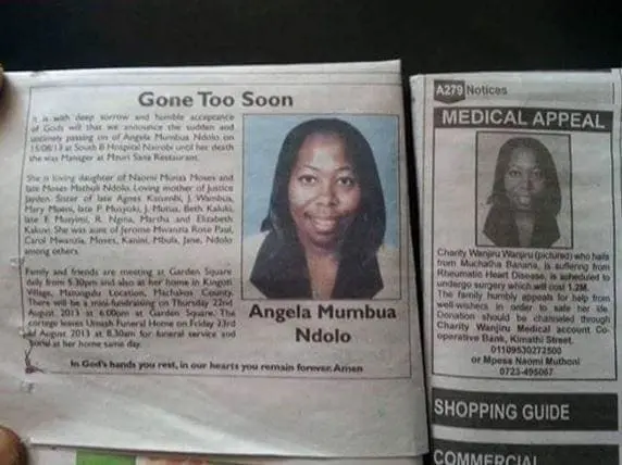 Without an iota of respect for the dead and their loved ones, these cons buy newspapers mostly for the obituaries section. While the bereaved go out of their way to mourn and spread the news of the passing of a deceased loved one, these unknown cons use the obituary photos to appeal for medical assistance from unsuspecting Kenyans.