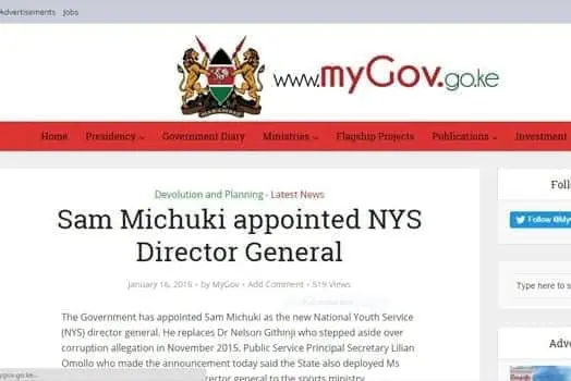 Mr Michuki’s appointment, also announced by the government website, mygov.go.ke –the report is still available online here- and was widely reproduced on local media.