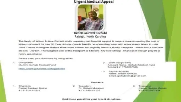 The family of Wilson & Jane Gichubi kindly requests your financial support & prayers towards meeting the cost of kidney transplant for their 30 Year old son, Dennis Muriithi, who was diagnosed with acute kidney failure in June 2015. Dennis undergoes dialysis three times a week and urgently needs a kidney transplant. Dennis has a four year old son – Jayden. The budgeted cost of the transplant is $40,000. Any kind of help – financial or through prayers is highly appreciated.The family of Wilson & Jane Gichubi kindly requests your financial support & prayers towards meeting the cost of kidney transplant for their 30 Year old son, Dennis Muriithi, who was diagnosed with acute kidney failure in June 2015. Dennis undergoes dialysis three times a week and urgently needs a kidney transplant. Dennis has a four year old son – Jayden. The budgeted cost of the transplant is $40,000. Any kind of help – financial or through prayers is highly appreciated.The family of Wilson & Jane Gichubi kindly requests your financial support & prayers towards meeting the cost of kidney transplant for their 30 Year old son, Dennis Muriithi, who was diagnosed with acute kidney failure in June 2015. Dennis undergoes dialysis three times a week and urgently needs a kidney transplant. Dennis has a four year old son – Jayden. The budgeted cost of the transplant is $40,000. Any kind of help – financial or through prayers is highly appreciated.The family of Wilson & Jane Gichubi kindly requests your financial support & prayers towards meeting the cost of kidney transplant for their 30 Year old son, Dennis Muriithi, who was diagnosed with acute kidney failure in June 2015. Dennis undergoes dialysis three times a week and urgently needs a kidney transplant. Dennis has a four year old son – Jayden. The budgeted cost of the transplant is $40,000. Any kind of help – financial or through prayers is highly appreciated.The family of Wilson & Jane Gichubi kindly requests your financial support & prayers towards meeting the cost of kidney transplant for their 30 Year old son, Dennis Muriithi, who was diagnosed with acute kidney failure in June 2015. Dennis undergoes dialysis three times a week and urgently needs a kidney transplant. Dennis has a four year old son – Jayden. The budgeted cost of the transplant is $40,000. Any kind of help – financial or through prayers is highly appreciated.The family of Wilson & Jane Gichubi kindly requests your financial support & prayers towards meeting the cost of kidney transplant for their 30 Year old son, Dennis Muriithi, who was diagnosed with acute kidney failure in June 2015. Dennis undergoes dialysis three times a week and urgently needs a kidney transplant. Dennis has a four year old son – Jayden. The budgeted cost of the transplant is $40,000. Any kind of help – financial or through prayers is highly appreciated.The family of Wilson & Jane Gichubi kindly requests your financial support & prayers towards meeting the cost of kidney transplant for their 30 Year old son, Dennis Muriithi, who was diagnosed with acute kidney failure in June 2015. Dennis undergoes dialysis three times a week and urgently needs a kidney transplant. Dennis has a four year old son – Jayden. The budgeted cost of the transplant is $40,000. Any kind of help – financial or through prayers is highly appreciated.The family of Wilson & Jane Gichubi kindly requests your financial support & prayers towards meeting the cost of kidney transplant for their 30 Year old son, Dennis Muriithi, who was diagnosed with acute kidney failure in June 2015. Dennis undergoes dialysis three times a week and urgently needs a kidney transplant. Dennis has a four year old son – Jayden. The budgeted cost of the transplant is $40,000. Any kind of help – financial or through prayers is highly appreciated.The family of Wilson & Jane Gichubi kindly requests your financial support & prayers towards meeting the cost of kidney transplant for their 30 Year old son, Dennis Muriithi, who was diagnosed with acute kidney failure in June 2015. Dennis undergoes dialysis three times a week and urgently needs a kidney transplant. Dennis has a four year old son – Jayden. The budgeted cost of the transplant is $40,000. Any kind of help – financial or through prayers is highly appreciated.