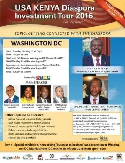 KPRA (Kenya) in conjunction with The Kenya Embassy and The East Africa Chamber of Commerce invites you to the US Kenya Diaspora Investment Tour 2016 stop in Washington, DC on Tuesday, May 31st .