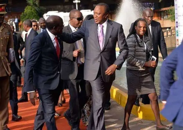President Uhuru Kenyatta converse with Unctad Secretary-General Mukhisa Kitui during the closing ceremony of the event at KICC in Nairobi on July 22, 2016. Kenya supplied transport services worth $170.5 million (Sh17 billion), making it the fourth largest supplier behind Denmark, Russia and the US, but followed by Ethiopia in the region. PHOTO | SALATON NJAU | NATION MEDIA GROUP
