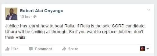 On Sunday, Alai posted a message that suggested President Uhuru Kenyatta will easily defeat his political opponent Raila Odinga during the 2017 general elections.