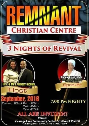 See the poster where the late Bishop Susan Wangui from Limuru was to be a guest speaker in London