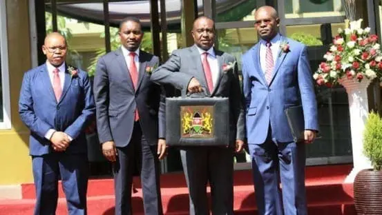 Planning Principal Secretary Saitoti Torome (left) Devolution CS Mwangi Kiunjuri (centre) Treasury CS Henry Rotich and Treasury PS Kamau Thugge before the budget statement