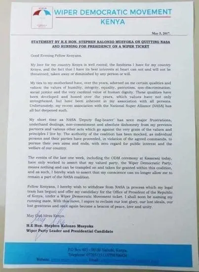The letter stated that Kalonzo had quit NASA, which chose him as ODM leader Raila Odinga’s running mate in the election.