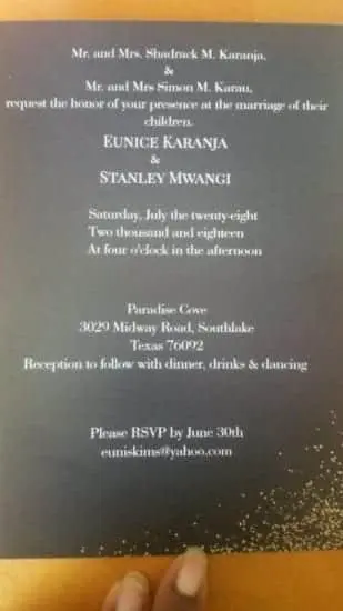 Mr and Mrs Shadrack M. Karanja & Mr and Mrs Simon M. Karau invites family and friends to their children’s (Eunice Karanja and Stanley Mwangi) wedding celebration on July 28th 2018 at Southlake Texas.