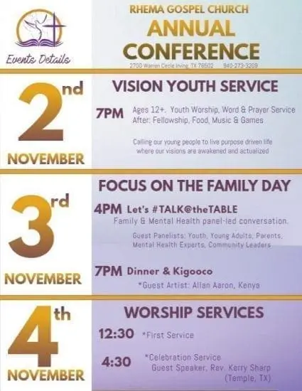 Rhema Gospel Church in Irving, TX and Rev. Dr. Solomon Waigwa invite you to their three day Annual Conference on November 2nd – 4th, 2018. The theme of this conference is “Speak the Word Only” and calls us as individuals and families to invest in the kingdom and in our families.