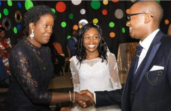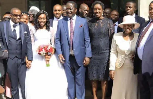 Accompanied by his daughter Rosemary, Odinga graced the wedding held at the Nairobi Academy and wished the couple – Daniel Kamau and Evelyn Mueni – a blessed union.