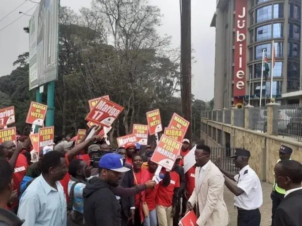Supporters, holding placards written “Kibra For Mariga; Mariga Ni Wetu”, sang songs in praise of Mariga as they made their way into the Jubilee headquarters.