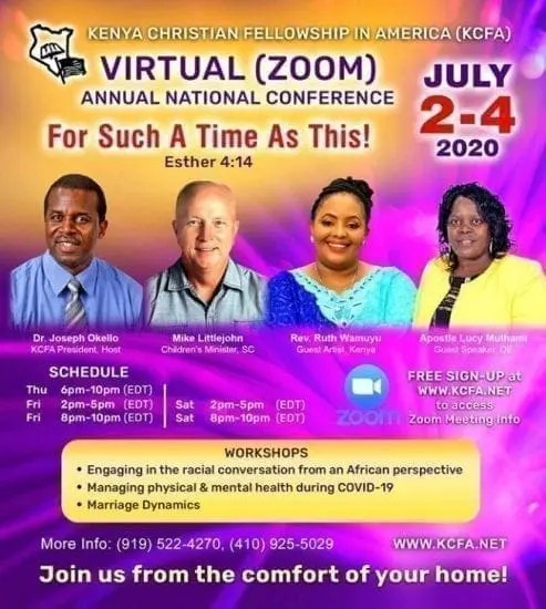 KCFA’s annual national conference is going virtual this year, and will run from Thursday, July 2, 2020 to Saturday, July 4, 2020. You will be able to follow the conference proceedings, and perhaps even participate, from the comfort of your home. The speakers will include our very own Apostle Lucy Muthami and Dr. Joseph Okello, KCFA’s 7th president. The speaker for the youth program will be Rev. Mike Littlejohn. Rev. Ruth Wamuyu will grace the occasion from Kenya as our featured musician, and we hope she returns next year in person for a more interactive ministry.