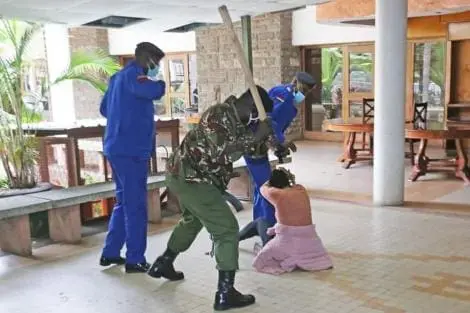 In photos and videos seen by Kenyans.co.ke, Mutheu is seen on the floor as four police officers surrounded her awith one of them blandishing what appears to be a rungu.