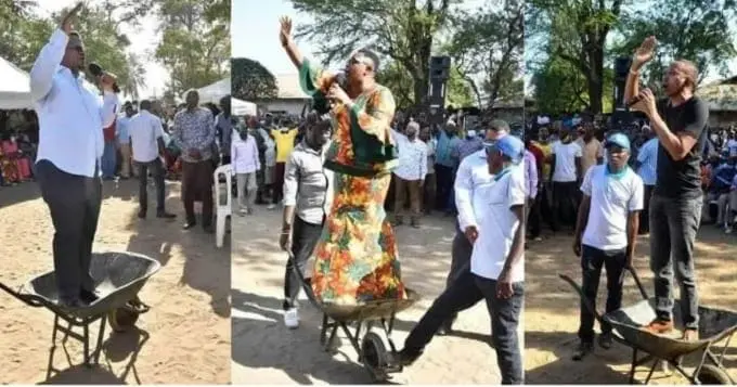 The MPs who accompanied Ruto on Saturday, February 6 had a hard time playing a balancing act atop the wheelbarrow in a Ruto rally at Mombasa County, many of them relying on bodyguards to boost stability.