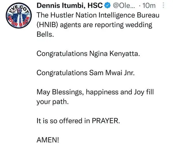 Itumbi in a social media post wishes them the best.”The Hustler Nation Intelligence Bureau (HNIB) agents are reporting Wedding Bells. Congratulations Ngina Kenyatta. Congratulations Sam Mwai Jnr. May Blessings, happiness, and Joy fill your path,” Itumbi posted.